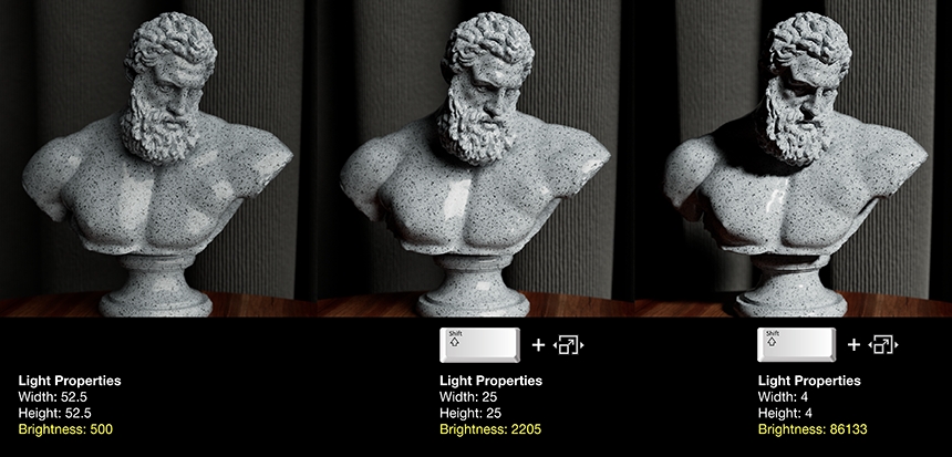 By holding Shift, the software handles the technical compensation automatically. As you scale your light larger to soften shadows, the brightness decreases proportionally to maintain the same total energy output. Scale it smaller for harder shadows, and the intensity increases accordingly.